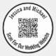 Você pode substituir a imagem de exibição pelo seu código QR de casamento. Há duas linhas de texto de exibição em preto que você pode editar para mostrar uma mensagem personalizada. Estes adesivos elegantes têm texto preto num círculo branco. O adesivo tem uma borda preta.