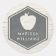 Um adesivo com ilustração de um hexágono com recorte em forma de maçã. Personalize o nome. O fundo é um tijolo branco. Procure por itens correspondentes na Escola Rosa.
