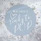 Um adesivo de chá de bebê moderno e minimalista personalizado com seu nome, apresentando um coração desenhado à mão fofo e tipografia estilosa em um fundo azul empoeirado. Criado por Thisisnotme©