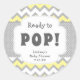 Pronta para o pop chá de fraldas em um adesivo em amarelo, branco e cinza.