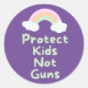 Adesivo redondo com texto "Proteger Crianças Não Armas" no estilo de letra verde da casa da moeda e gráfico arco-íris pastel em fundo roxo.