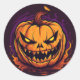 O adesivo redondo é mostrado com uma impressão de abóbora assustadora no Halloween. Personalize este item ou comprar como está.