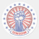 Um design de t-shirt pro-sindical com um punho elevado num círculo de estrelas e listras vermelhas, brancas e azuis, e com "união" numa faixa de arcos na base. Camisas, suores, botões, canecas, presentes.