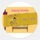 Autocolantes com design de Purim que inclui uma megila, granizadores (ruidosos) e imagens de Mordekhai, Esther, Ahashverosh, Haman e Hamantaschen (pastelarias feitas sob a forma de chapéu de Haman)