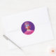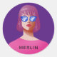 Um adesivo clássico, roxo, com uma mulher clássica, cabelo roxo e óculos, e nome personalizável. Para cartas de música, presentes, para escola e escritório.