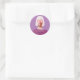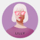 Um adesivo clássico, roxo e chique, com uma mulher elegante, cabelo e óculos cor-de-rosa, e nome personalizável. Para cartas de música, presentes, para escola e escritório.