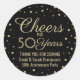 Adicione um toque final personalizado aos bilhetes de agradecimento ou lembrancinhas de aniversário de casamento com esses adesivos redondos ou selos de envelope pretos e dourados. Todo o texto é simples de personalizar ou excluir. Este modelo é configurado para um aniversário de 50 anos, mas pode ser facilmente alterado para outro ano ou evento, como um aniversário. O design apresenta pontos de confete em folha dourada em um fundo preto, "Brindamos a 50 anos" em caligrafia estilosa e uma mensagem personalizável em tipografia minimalista moderna na parte inferior. Por favor, note que o dourado é uma cor impressa, não folha metálica.