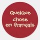 Quelque escolheu en français, "Algo em francês" em francês; Creme em fundo vermelho, Diversão para os estudantes franceses vestirem ou exibirem; quando perguntado o que "Quelque escolheu en français" significa, a resposta poderia começar uma conversa "Quem está na Primeira". Diversão para a promoção de línguas estrangeiras, Semana da Língua Estrangeira, clube francês, etc.