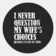 Adesivo Redondo Quote I Never Question My Wife's Choices Husband