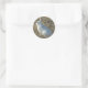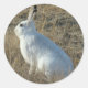Snowshoe Hare round Sticker. Às vezes, até mesmo as naturezas-mães planeiam encharcado pelo tempo, esta lebre de neve transformou-se no seu casaco de inverno branco, mas as neves do inverno estão atrasadas e, em vez de serem camufladas, ela se destaca agora contra as gramíneas pardas.