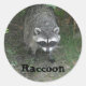 Este adesivo apresenta uma captura excelente deste curioso guaxinim que saiu correndo de alguns arbustos em um chão de parque. Olhos de barriga cheia com bigodes longos fazem esse guaxinim parecer misterioso.