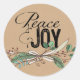 Os adesivos de Natal com uma aparência natural e simples apresentam um papel kraft bronzeado, com texto tipográfico preto que lê Peace & Joy e um som de ramos e bagas amarrados com fita!
