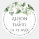 Este elegante adesivo floral redondo apresenta um belo ramo de eucalipto com flores brancas e folhas verdes sábias no topo. Os nomes do casal estão na tipografia decorativa. Há uma borda fina em volta dela.