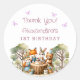 Celebre o primeiro aniversario da sua menina com este adorável e personalizado obrigado de animais da floresta que você escolhe! Apresentando um urso bonito, raposa, esquilo e coelho tendo uma festa na floresta, este design é cheio de charme. Os animais se reúnem em torno de uma mesa de toco de árvore, aproveitando bolos e bebidas deliciosos, enquanto árvores verdes somam à atmosfera festiva. Colocado contra um fundo branco nítido, este doce obrigado que você cola é perfeito para favoritos para festas e irá adicionar um toque especial à primeira celebração de festa de aniversário de sua garota. Expresse sua gratidão em estilo com essa bonitinha e memorável manutenção!