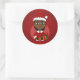 Etiquetas redondas com uma ilustração de uma menina afro-americana sorridente e de cabelo preto curto, a menina está vestindo uma fantasia de Papai Noel com um chapéu vermelho e segurando um presente; em um círculo vermelho sobre um fundo vermelho
