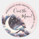 Trendy Watercolor Sobre O Vedante Redondo Do Chá de fraldas Da Lua. Adicione um toque de acabamento mágico ao seu chá de fraldas com este adesivo redondo com tema celeste. A design apresenta um sonho aquoso céu noturno com uma lua brilhante colocada na parte inferior esquerda, cercada por estrelas cintilantes para um efeito caprichoso. No canto superior direito, a frase "Sobre a Lua" aparece na tipografia elegante do script. Ao redor da borda do adesivo, você pode personalizar com o nome da futura mãe e a data do evento para um detalhe doce e personalizado. O plano de fundo inclui um gradiente rosa com pincel suave, embora você possa alterá-lo para azul, neutro ou qualquer paleta para corresponder ao estilo do seu chá. Perfeito para favorecer selos, encerramentos de envelopes ou decoração, este adesivo adiciona um toque encantador à celebração.