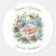 Uma raposa bonita dorme enrolada em uma floresta nevada cercada por uma coroa de inverno composta por tosferas de abeto, pínus, bagas e flocos de neve.