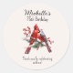 Lindos Cardinais vermelhos e bagas no inverno de neve, 75 anos, selo de envelope "Obrigado" ou adesivos de mala, personalizados com o nome da convidada de honra e sua idade, junto com a mensagem "Obrigado por celebrar conosco". Entre em contato comigo para obter assistência com suas personalizações ou para solicitar outros produtos Zazzle correspondentes ou coordenadores para sua celebração.