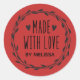 Um autocolante personalizado "feito com amor" em um fundo vermelho cercado por uma coroa de louros. Faça-o seu adicionando seu próprio nome. Um bonito toque final para todos os presentes feitos à mão. Projetado para você pelo Blackberry Boulevard.