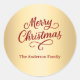 Um fundo com aspecto dourado, texto vermelho. Feliz Natal é escrito com uma letra de estilo escrita à mão. Personalize e adicione um ano e seu nome de família.