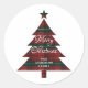 Red green plaid tree personalized Merry Christmas classic round sticker. Easy to change the text. Cute red and green plaid Christmas tree with Merry Christmas white script and name on the tree.