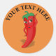 Um personagem de desenho animado de pimenta vermelho e quente. Design original. A imagem, o texto e a cor de fundo podem ser personalizados para criar um produto exclusivo. Uma sugestão de um dos meus clientes: "Este adesivo personalizável é perfeito para o tema fiesta da nossa noiva. Estamos a fazer garrafas de molho quente e a usar estes autocolantes nas etiquetas de pendurada. Tão fofo!"