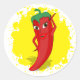 Um personagem de desenho animado de pimenta vermelho e quente. Design original com fundo de tela de tinta amarela. Autocolantes personalizados. Ideia do presente.