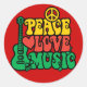 Digite design de PEACE, LOVE & MUSIC com guitarra, Símbolo de Paz, Notas de Coração e Música em amarelo, vermelho e verde.