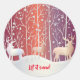 Estes adesivos redondos perfeitos para as festas têm uma cena de inverno de renas na floresta com árvores negras e neve caindo contra um fundo vermelho, e as palavras Deixem-na nevar!