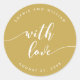 O adesivo de favor de casamento com as palavras "com amor" em um texto cursivo relaxado em branco contra uma cor de fundo editável (clique em personalizar para acessar). Personalize-o substituindo o texto do marcador de posição. Para obter mais opções, como alterar a fonte e seu tamanho/cor, expanda a curva/contrato ou o espaçamento entre letras, clique no botão "Personalizar". *Observe que a Marca d'água do Zazzle que aparece na visualização de zoom NÃO aparecerá no produto impresso final. © Rosewood e Citrus