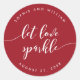 O adesivo de favor de casamento com as palavras "deixe o amor brilhar" em um script cursivo relaxado em branco contra uma cor de fundo editável (clique em personalizar para acessar). Personalize-o substituindo o texto do marcador de posição. Para obter mais opções, como alterar a fonte e seu tamanho/cor, expanda a curva/contrato ou o espaçamento entre letras, clique no botão "Personalizar". *Observe que a Marca d'água do Zazzle que aparece na visualização de zoom NÃO aparecerá no produto impresso final. © Rosewood e Citrus