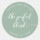 Um adesivo de favor de casamento com as palavras "a mistura perfeita" em um script cursivo relaxado em branco contra uma cor de fundo editável (clique em personalizar para acessar). Personalize-o substituindo o texto do marcador de posição. Para obter mais opções, como alterar a fonte e seu tamanho/cor, expanda a curva/contrato ou o espaçamento entre letras, clique no botão "Personalizar". *Observe que a Marca d'água do Zazzle que aparece na visualização de zoom NÃO aparecerá no produto impresso final. © Rosewood e Citrus
