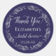 Esses belos adesivos são perfeitos para agradecer aos convidados em um chá de noiva. O design apresenta texto em letra cursiva sofisticada em um fundo azul-marinho com uma borda de renda prateada em foil falso. O texto diz Obrigado, com espaço para o nome da noiva e a data. Elegantes e sofisticados, esses adesivos certamente agradarão.