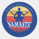 Setembro é o Mês Nacional de Yoga. Celebrar com este design retrógrado do pôr do sol design com uma pessoa meditando e as palavras, "paz, amor, luz" e "namaste".