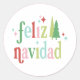 Este adesivo brincalhão mostra o ditado "Feliz Navidad" com cores alternadas e sotaques brilhando. As cores incluem rosa, vermelho, verde e azul claro.