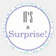 Celebrar sua chegada com isto É uma surpresa! Clássico Redondo. Esta design apresenta o texto "É uma surpresa!" em letras pretas e roxas com um simples padrão de pontos de fundo azul, verde e roxo.