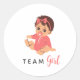 Essos adesivos redondos adoráveis apresentam uma menina bebê em um macacão rosa com um bico e o texto "Equipe Menina". Uma maneira divertida e elegante de decorar lembranças, envelopes ou decoração de festa na sua celebração de revelação de gênero.