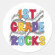 Grande texto brilhante em cores primárias lê "Rochas da Classe 1rua" sobre um fundo de música em lâminas pretas na rua Rocks Professora e T-shirts, capuzes, canecas, sacos de tota da escola, cartões, adesivos, ímanes e muito mais!