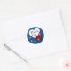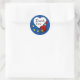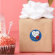 Etiquetas de espaço de bolinhas azuis. Um grande coração branco com as palavras obrigado. Na parte inferior direita está um foguete vermelho voando pelo espaço com três estrelas amarelas à direita do foguete.