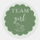 Celebrate your big surprise in timeless, preppy style with this elegant Team Girl Gender Reveal Party Sticker, designed for modern parents who love classic, heirloom-inspired baby celebrations. Featuring a soft sage green background, a charming vintage rocking horse illustration, and sophisticated typography, this design blends old-money baby shower aesthetics with sweet, playful charm.