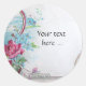Elegante, clássico, vibrante e clássico design floral. Rosas vermelhas, cor-de-rosa, flores azuis com uma pomba branca carregando uma letra numa paisagem marinha.