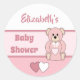 Personalize esses chás de fraldas com o nome da mãe que será. Projetado em rosa e branco com um ursinho de pelúcia rosa e alguns corações. Use para manter as bolsas a favor da parte ou talvez para um selo de envelope.