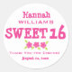 O texto cor-de-rosa cria um doce obrigado 16 que você cola. O texto cor-de-rosa contém uma variedade de quadril e fontes legal que são perfeitas para uma menina adolescente. Três pequenas flores tornam-no ainda mais doce. O primeiro e sobrenome dela está no topo. Doce 16 está escrito em uma fonte grande com três pequenas flores cor-de-rosa para chamar ainda mais atenção para seu aniversário. Obrigado por Comming está escrito em uma simples fonte rosa e depois sua data de aniversário. Todo texto é facilmente personalizado.