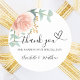 Um fundo branco na moda. Decorados com ouro rosa verde e cor-de-rosa esbranquiçada floral, rosa, folhas de eucalipto, prigos, verde, folhas de ouro falsas. Personalize e adicione seus nomes e uma data. Com o texto: Obrigado! + um pequeno coração.