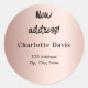 Mudamos a etiqueta do endereço de retorno. Personalize e adicione seu nome e novo endereço. Um fundo rosa dourado.