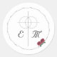 Design apresenta o símbolo tradicional de cruz e anéis, exibido no centro entre as iniciais da noiva e do noivo. Fonte nupcial de iniciais, além da borda florescente, adiciona o aspecto de elegância e sofisticação. Projetado para coordenar com a suíte de casamento católico das Rosas Finas.