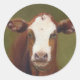 Rosto de vaca castanho e branco de uma pintura de uma novilha chamada "Grande Mama". A pintura é de Susan Roberts.