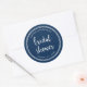 Etiqueta náutica redonda à moda do chá de panela que caracteriza uma beira branca das listras e a palavra "chá de panela" no roteiro na moda da escova contra um fundo azul. Use-o para selar seus envelopes. Verifique para fora outros artigos aqui https://www.zazzle.com/rosewoodandcitrus/gifts?cg=196540141241316965&rf=238364477188679314 do casamento