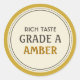 Rotule seu xarope de bordo para venda de acordo com o novo sistema de formando desenvolvido pelo Instituto Internacional de Xarope Maple. Marca bege com bordas pretas e douradas. O texto diz "sabor rico grau A âmbar".