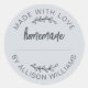 Adesivo azul pastel Feito Com Amor com tipografia preto-desligada e um design de letra manuscrita. Perfeito para selar produtos assados, potes de geleia, biscoitos, pão, caixas de torta, embalagens de pequenos negócios, lembrancinhas de festa e presentes artesanais. Apresenta uma linha de nome personalizável, tornando-o ideal para padeiros caseiros, artesãos e pequenas marcas que buscam um acabamento suave e limpo. Personalize facilmente com seu nome ou detalhes da loja.